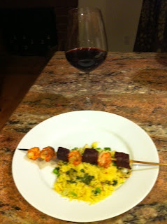 Anyway this recipe is very easy and filled with flavor. The shrimp is marinated in a spicy lemon marinate and then threaded on skewers with the chorizo and grilled. Did learn a valuable lesson...the chorizo drips grease which can cause combustion in a bbq...minor details. The couscous is also very flavorful as it is cooked in chicken broth and has peas, green onions, olives, almonds, cilantro and saffron added to it. It is very moist and has a lot more flavor than regular couscous. Try it you will like it!